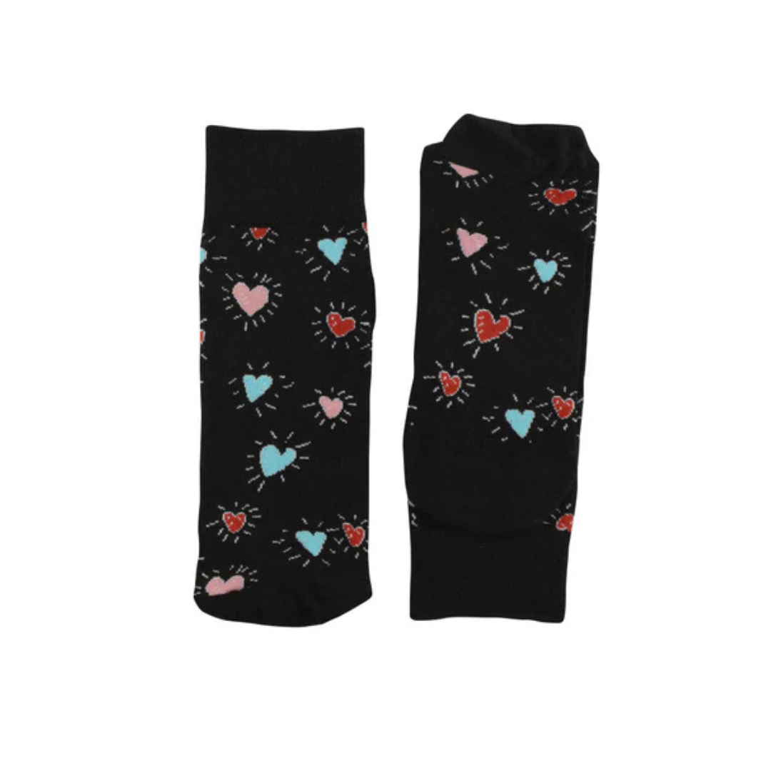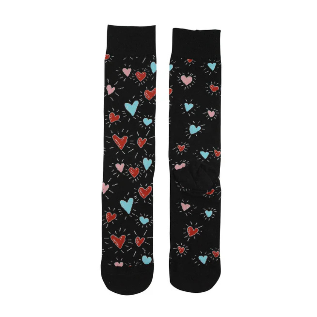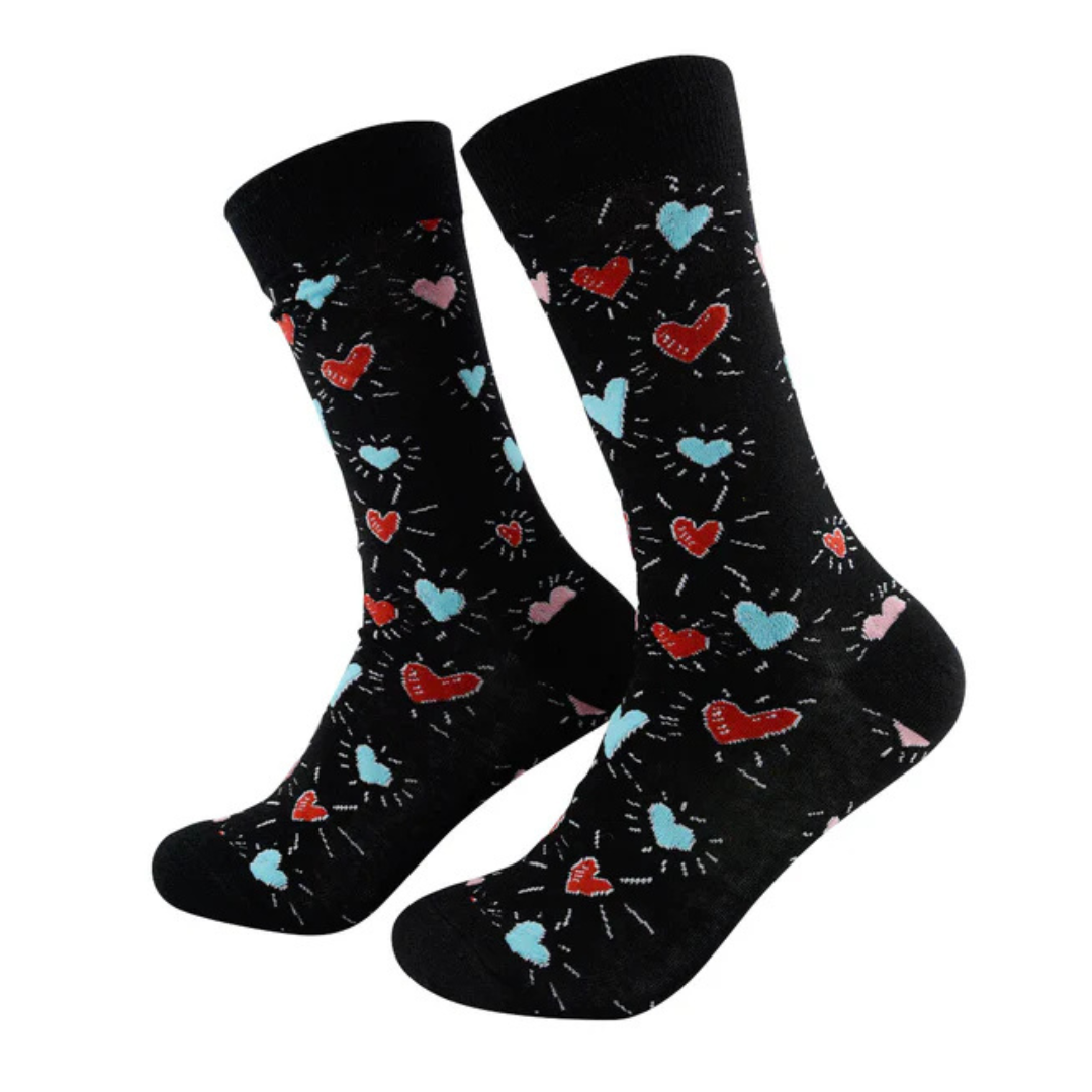 Llena tus pasos de buena onda con estos calcetines negros decorados con corazones de colores cuáticos. Un diseño lleno de alegría que le da un toque divertido y romántico a cualquier look, perfecto para quienes caminan con corazón.