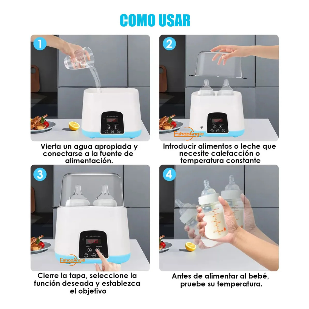 Este dispositivo calienta dos biberones al mismo tiempo, adecuado para gemelos y más bebés. El diseño de la tapa superior permite acomodar botellas altas, sosteniendo 2 mamaderas grandes de boca ancha. Compatible con la mayoría de las botellas en el mercado.
