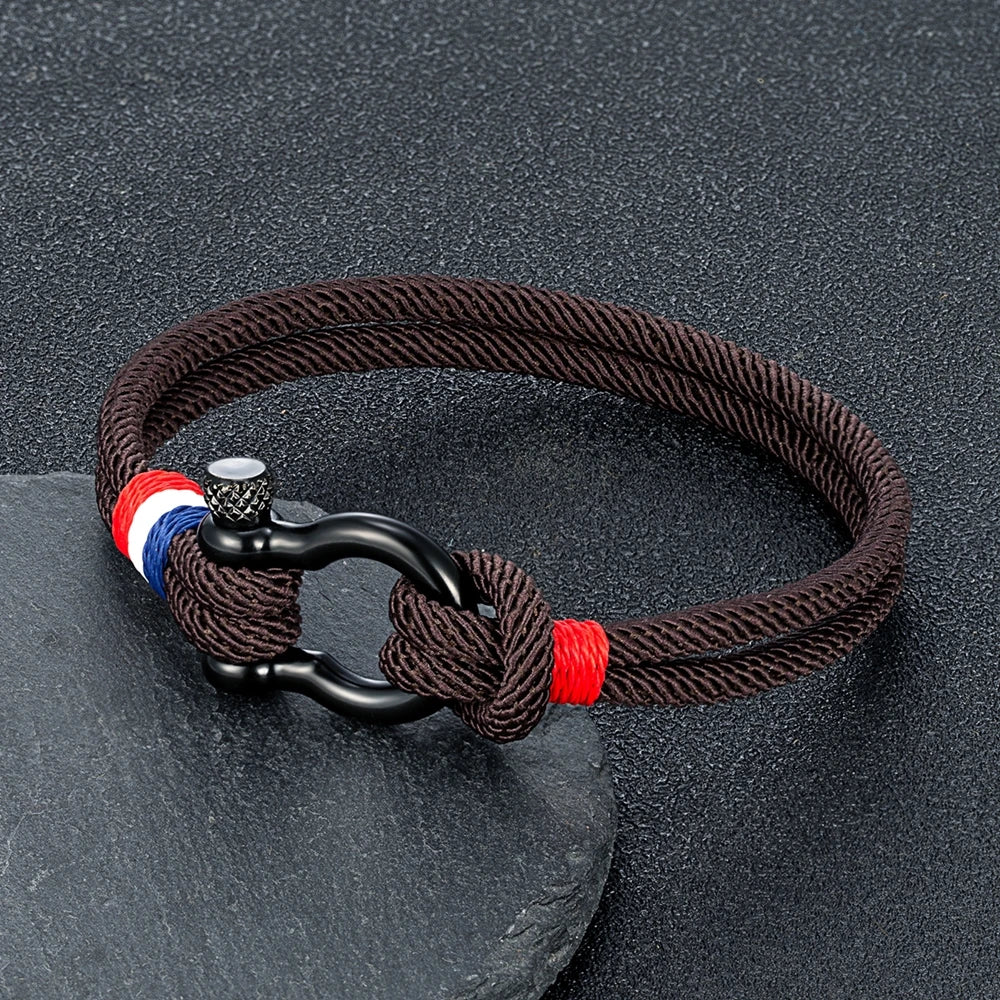 Pulsera unisex de diseño artesanal tejido a mano, con doble capa de cuerda náutica y hebilla de grillete en acero inoxidable negro. Incluye un distintivo detalle de la bandera de Francia, que aporta personalidad y un toque único.Disponible en longitudes de 19 cm, 21 cm y 23 cm, con cierre magnético seguro. Ideal como regalo para parejas, amigos o para quienes aprecian los accesorios con estilo y significado. Personalizable en color.
